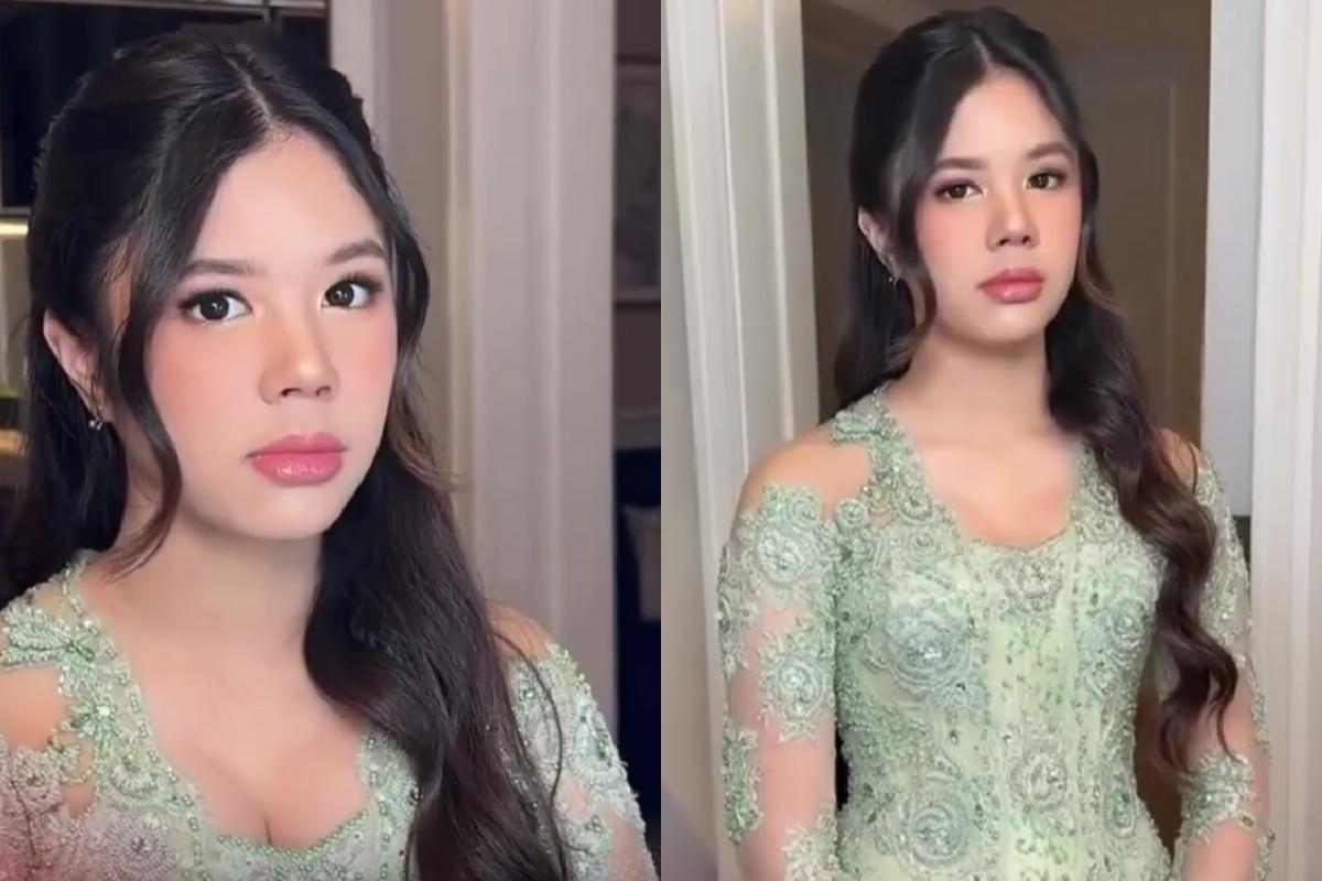 Shafeea Ahmad memilih gaun berwarna hijau sage yang memberikan kesan segar sekaligus klasik.